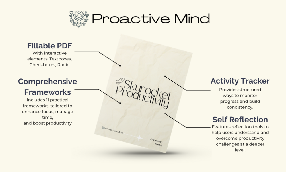 The Skyrocket Productivity Toolkit is an interactive digital guide that combines psychological insights with practical exercises to help you build productivity habits, overcome procrastination, and reach your goals faster. -